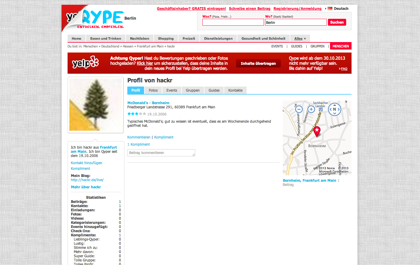 Qype gibt es leider nicht mehr, es wurde von Yelp aufgesaugt, der Vollständigkeit halber aber: